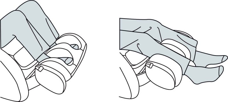 Masážní křeslo nabízí také péči pro dolní končetiny. Opěrka nohou je tvořena vzduchovými vaky, ve kterých čerpadlo cyklicky přečerpává vzduch. Uživatel si může nastavit takovou sílu stisku, která je mu příjemná. Podpěrka nohou je elektricky polohovatelná.